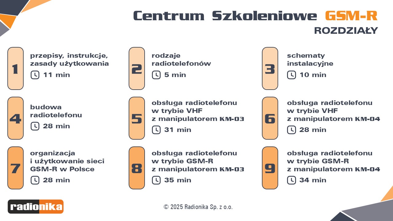 Program składa się z serii filmów szkoleniowych omawiających w jasny, przystępny i atrakcyjny sposób kluczowe kwestie teoretyczne oraz zajęć praktycznych prowadzonych w profesjonalnych warunkach przez instruktorów-ekspertów. Uczestnicy szkolenia przyswoją kluczową wiedzę z zakresu eksploatacji radiotelefonów we wdrażanym standardzie, zrealizują scenariusze testowe, poznają zachowanie systemu GSM-R, nauczą się rozwiązywać typowe sytuacje. Dla maszynistów to szansa, by sprawdzić swoją wiedzę w warunkach zbliżonych do rzeczywistych, zanim przyjdzie czas na pracę z urządzeniami w terenie.